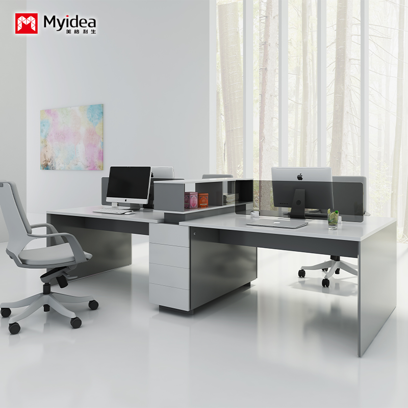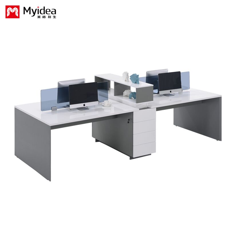 Meja staf 4 orang dengan laci penyimpanan, meja kantor dicat putih berkilau
