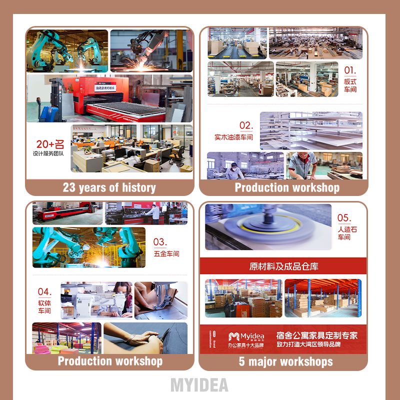 About us: Myidea Furniture was founded in 2003, is a manufacturer focusing on office furniture and apartment furniture. At present, we have more than 20 designers and more than 20,000 square meters of automated production plant. With the mission of "creating a better living environment", the company began to expand the global market in 2005, and is committed to providing services for excellent enterprises around the world, with cases in more than 40 countries.